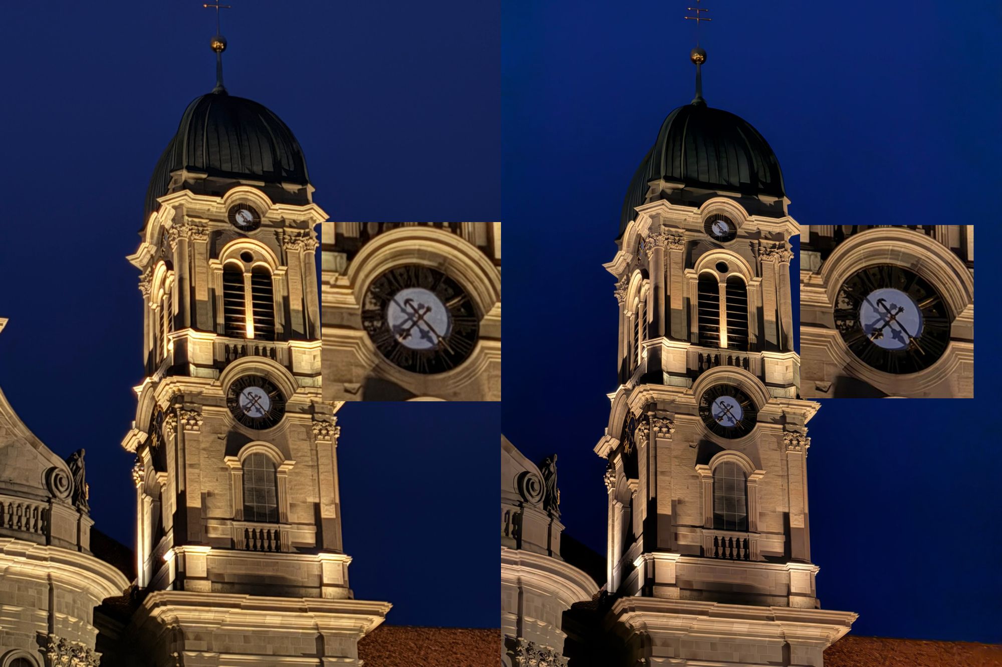 Auch bei Abendaufnahmen mit künstlicher Beleuchtung liefert das iPhone Air (links) praktisch identisch gute Bilder wie das iPhone 17 Pro (rechts). Zoomt man bei einem Detail heran, finden sich aber schon Unterschiede. (Quelle: SITM)