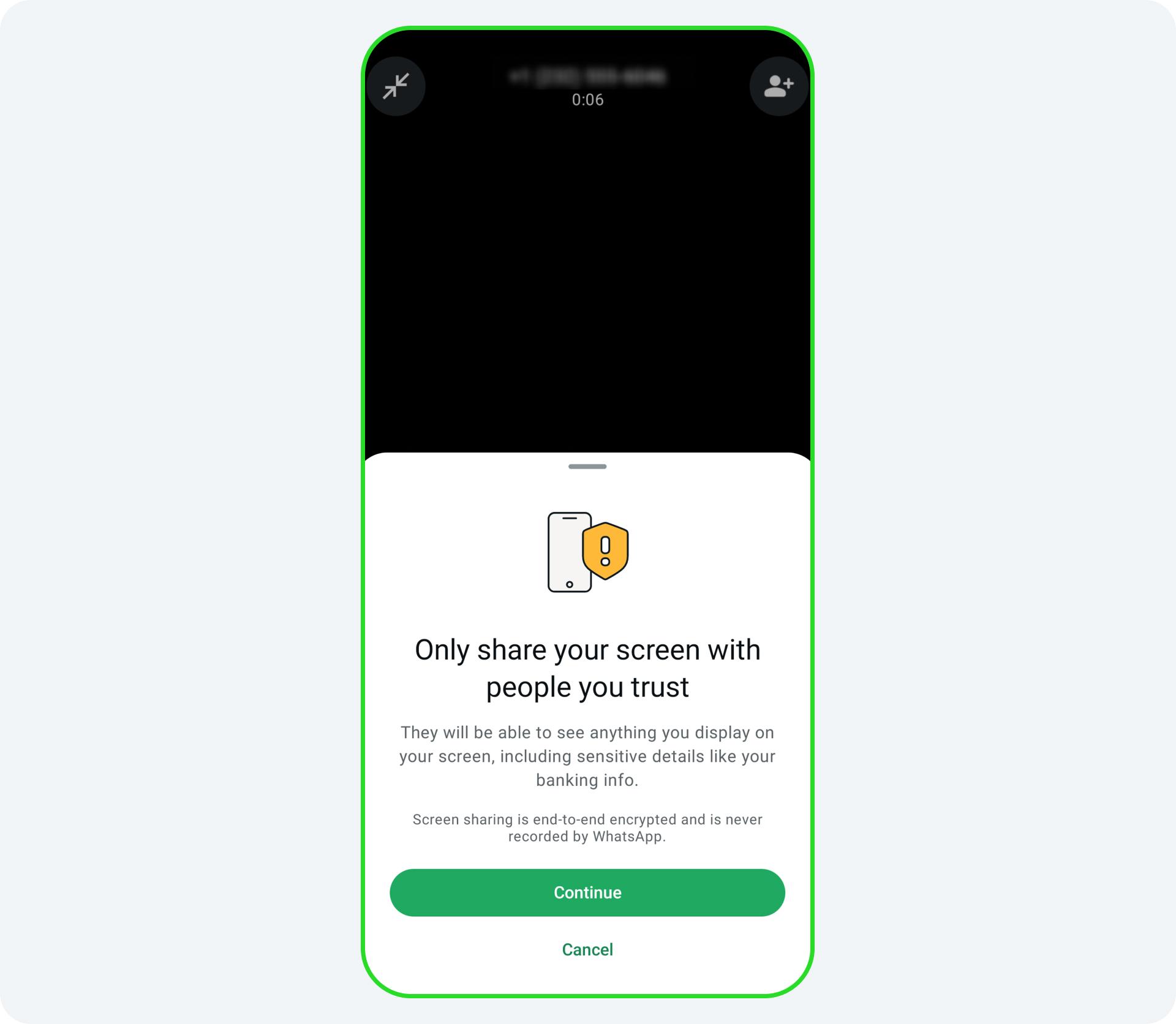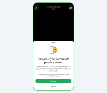 Whatsapp blende künftig Hinweise ein, wenn Nutzer während eines Videoanrufs ihren Bildschirm mit jemandem teilen, der nicht in den eigenen Kontakten steht. Laut Meta soll diese Warnung vor allem verhindern, dass Betrüger über einen geteilten Bildschirm sensible Daten wie Bankinformationen abgreifen.