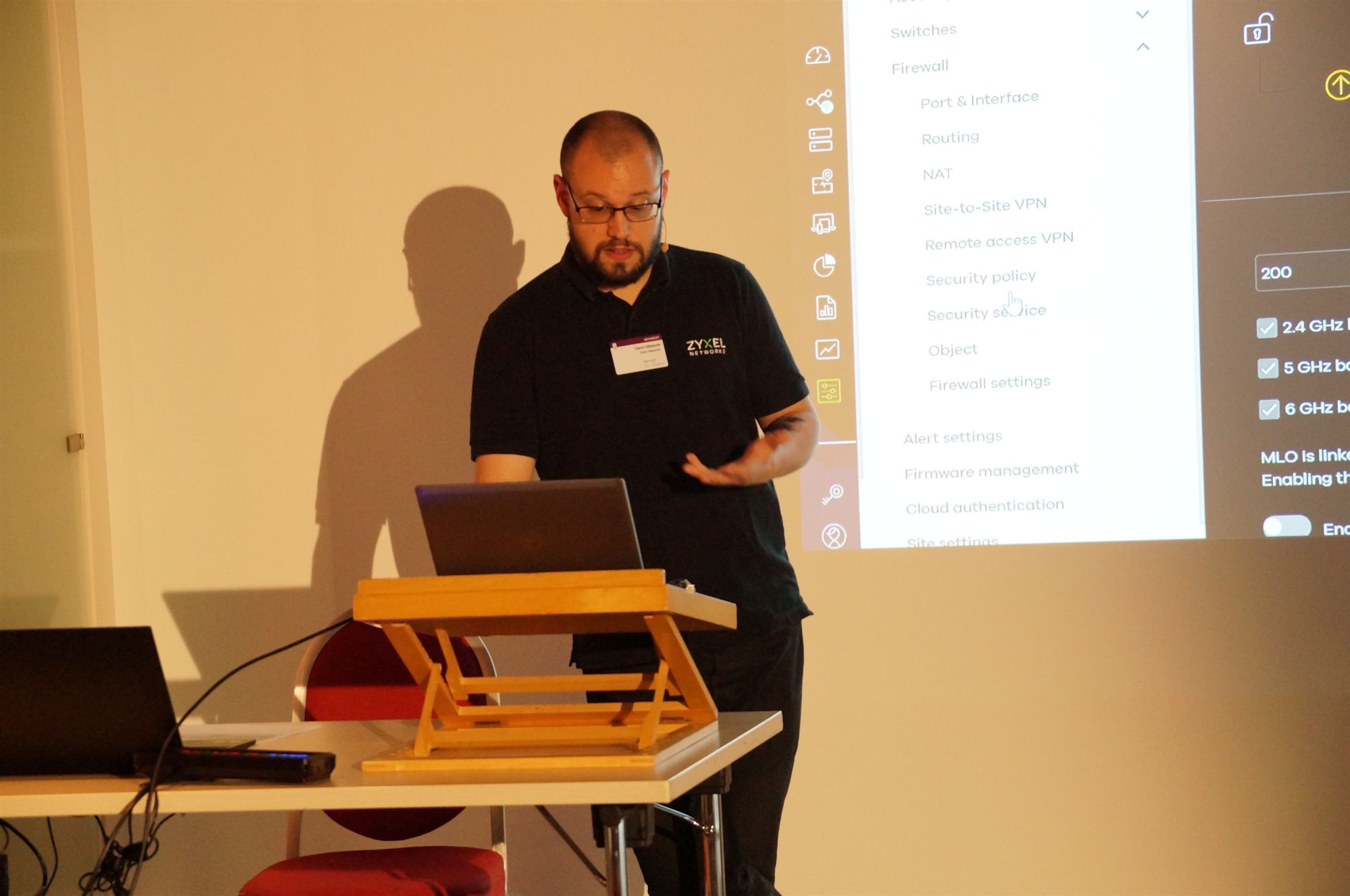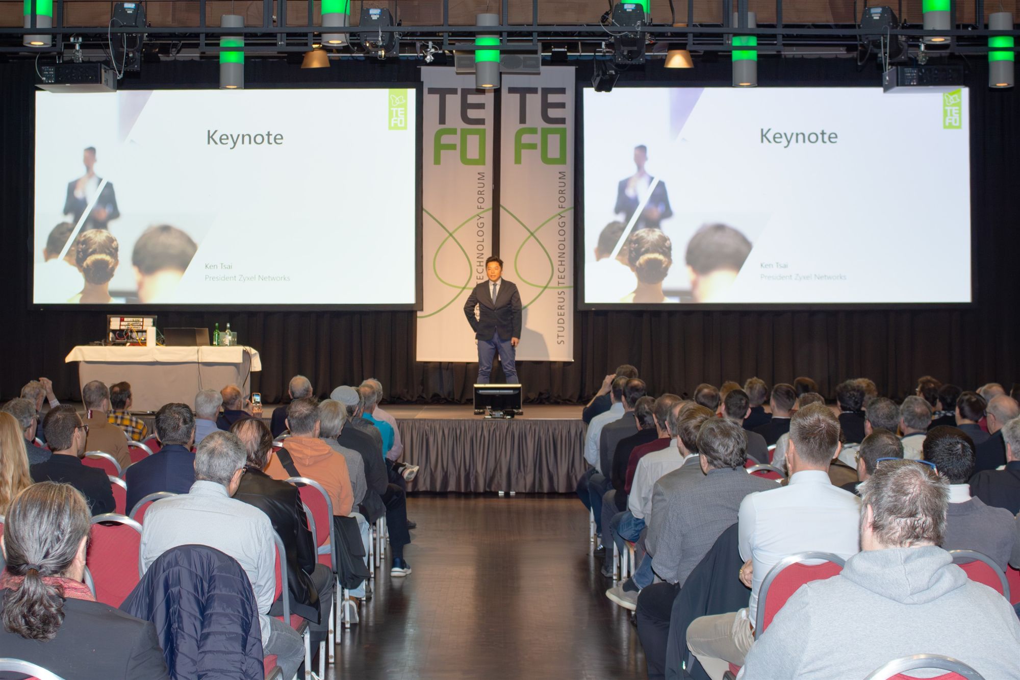 Studerus, sondern auch von Ken Tsai, dem Präsidenten von Zyxel Networks, der zum 15. TEFO-Jubiläum eigens aus Taiwan anreiste. Tsai würdigte das Jubiläum mit einer symbolischen Geste und überreichte Frank Studerus eine 15-jährige Whiskyflasche. In seiner Keynote thematisierte er die geopolitischen Herausforderungen in Taiwan, dem Heimatmarkt von