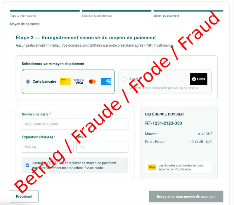 Angaben des Bundesamts für Cybersicherheit BACS werden auf den verlinkten Fake-Seiten (Bilder weiter unten) schrittweise Namen, E-Mail-Adressen, Telefonnummer, Geburtsdatum, AHV-Nummer, das Datum eines möglichen Umzugs und am Schluss die Kreditkartendaten abgefragt. Die Behörde spricht von einer mehrstufigen Datenernte, bei der am Ende ein vollständiges Paket an Identitäts- und Zahlungsinformationen vorliegt.