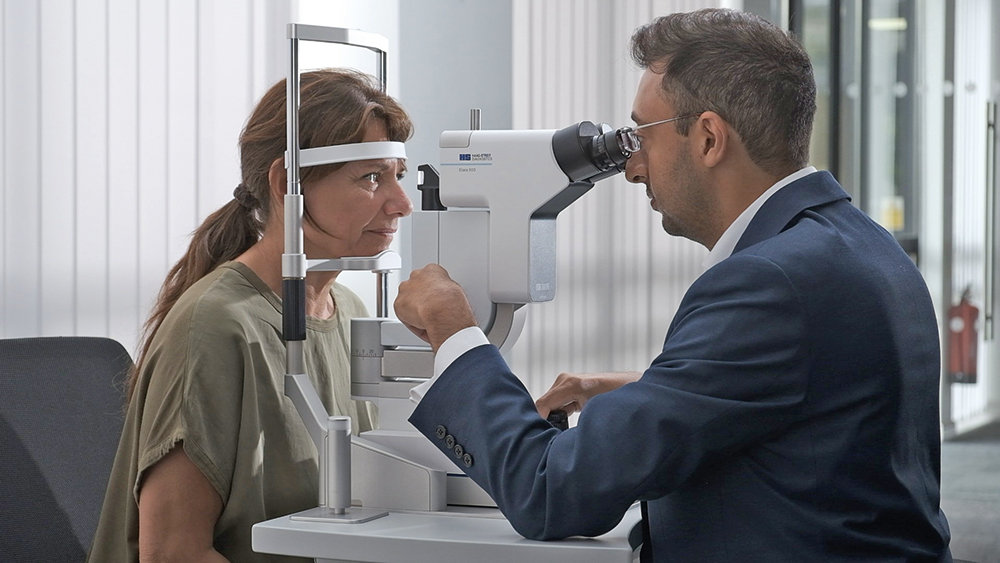Haag-Streit produziert hochspezialisiertes Equipment im Med-Tech-Bereich. Im Bild eines der wichtigesten Geräte für Augenärzte: Eine sogenannte Spaltlampe (auch Spaltlampenmikroskop genannt) für Untersuchungen am Auge des Patienten. (Quelle: Haag-Streit)