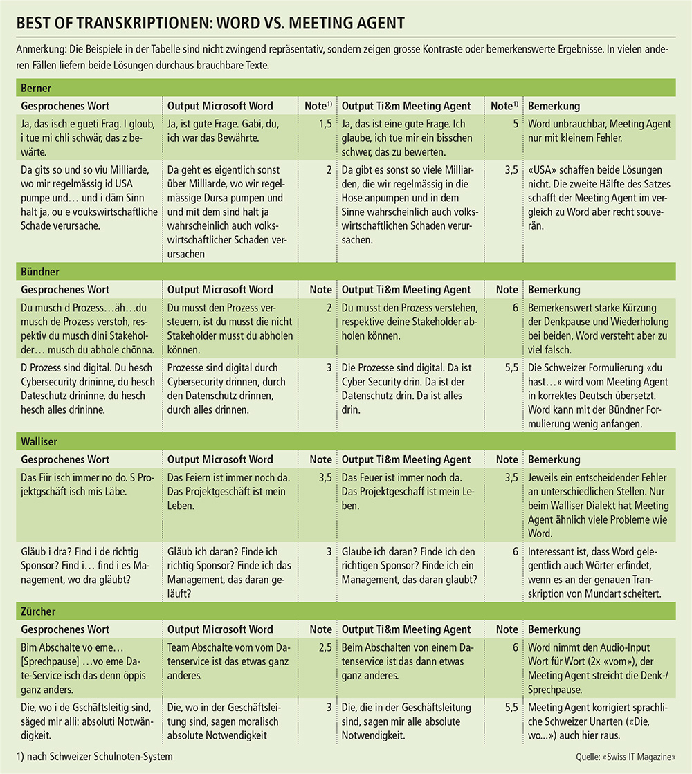 Spürbar besser arbeitet Word mit Sprechern aus Zürich und dem Wallis. Während der Meeting Agent hier weiter stabil performte, finden sich bei Word deutlich weniger krasse Schnitzer als beim Berner und Bündner Mundart. Gemessen am Ruf des Walliser Dialektes, der zuweilen auch anderen Deutschschweizern Kopfzerbrechen bescheren kann, ist das erstaunlich. Beim Zürcher Dialekt, der dem Hochdeutschen sowohl sprachlich als auch geografisch nähersteht, ergibt dieses Ergebnis mehr Sinn.