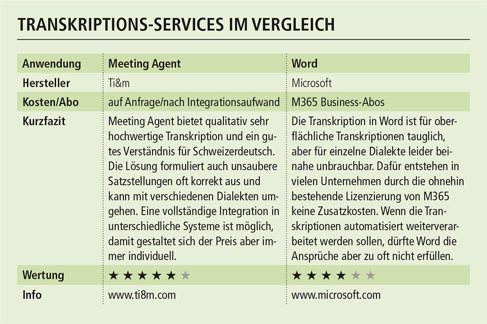 Während die Kosten für Word damit einfach kalkulierbar respektive eh schon Teil des IT-Budgets sind, ist es beim Meeting Agent wie angemerkt komplizierter. Auf Anfrage sagt das Unternehmen, dass die Integrationen aufgrund verschiedener Kundenwünsche unterschiedlich ausfallen (und damit unterschiedliche Kosten verursachen). Eine genaue Preisangabe ist daher nur individuell auf Anfrage möglich, das Tool ist nicht als einfache SaaS-Abo-Lösung zu haben. Die getestete Minimal-Integration wäre aber grundsätzlich zu haben und laut Hersteller in wenigen Tagen – sprich mit überschaubaren Kosten – beim Kunden integriert. Wenn man bereits Microsoft-Kunde ist, fährt man so oder so günstiger mit Word. Andererseits bietet die Custom-Integration je nach Use Case grosse Vorteile, die mit dem einfachen Funktionsumfang im Test nicht abgedeckt werden können.