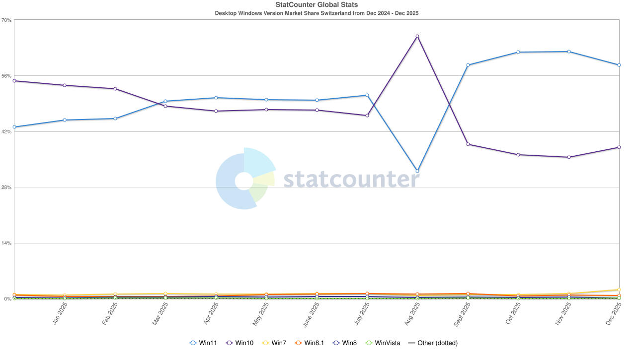 Selbst in der Schweiz, wo Windows 11 mit einem Marktanteil von 58,72 Prozent die Nase klar vorn hat, ging die Nutzung im Dezember deutlich zurück: Im November betrug der Anteil noch 61,98 Prozent. Windows 10 dagegen konnte von 35,51 auf 37,98 Prozent zulegen. Immerhin beträgt die Lücke zwischen den beiden Versionen hierzulande 20,74 Prozentpunkte. Zusammengefasst lässt sich dennoch sagen, dass der grosse Umstieg auf Windows 11 nach wie vor noch nicht umfassend erfolgt ist, auch wenn Microsoft in letzter Zeit verschiedene Verbesserungen und Leistungssteigerungen bei Windows 11 umgesetzt hat.