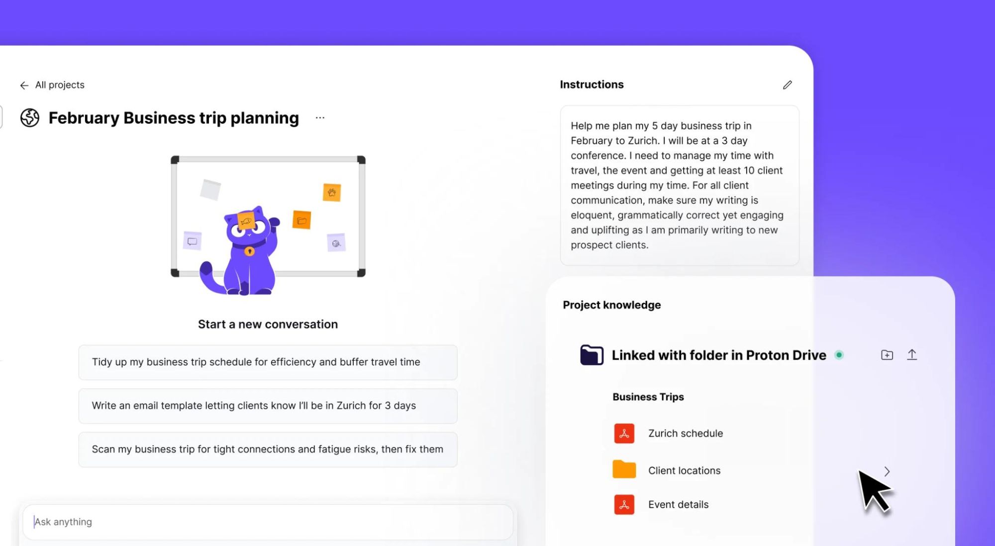 Die zentrale Funktion von Lumo 1.3 ist ein Feature namens Projects. Damit soll eine Arbeitsbereich geschaffen werden, in dem Chats, Dateien und weiter Parameter und Daten für eine Aufgabe respektive ein Projekt gesammelt und gebündelt werden können. Damit soll der KI-Assistent bei jeder Session den vollen Kontext der Aufgabe erfassen und verarbeiten können. Das ganze natürlich, ohne dass der Nutzer die Hoheit über seine Daten aus der Hand geben muss oder damit ein KI-Modell trainiert wird, wie Proton versichert. Ausserdem werden die Daten in den einzelnen Project-Workspace separat verschlüsselt. Eine Integration des hauseigenen Cloud-Speichers Proton Drive gibt’s ebenfalls.