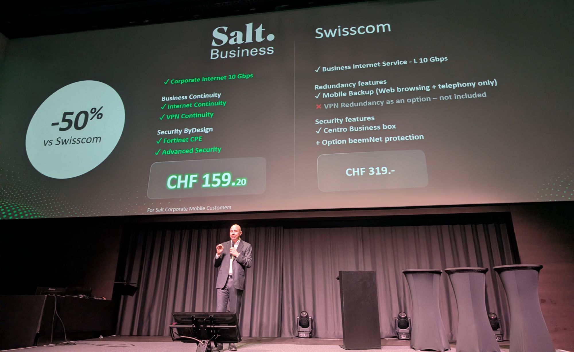 Salt wenig Zweifel daran gelassen, welchem Wettbewerber der Provider mit dem neuen Angebot Marktanteile abknöpfen will. Corporate Internet sei um die Hälfte günstiger als ein vergleichbares Angebot von Swisscom, rechnete Nunzianta auf der Bühne vor. Zwar steige man später in den Bereich ein als andere Anbieter, verfolge mit der Bündelung von Konnektivität, Continuity und Cybersecurity aber einen Ansatz, mit dem man sich von der Konkurrenz abhebe. Der CEO spricht von einer "Demokratisierung von Technologien", die bisher grossen Unternehmen vorbehalten waren, und bekräftigt: "Wir sind überzeugt, dass Swisscom in Vergangenheit nicht genügend herausgefordert wurde."