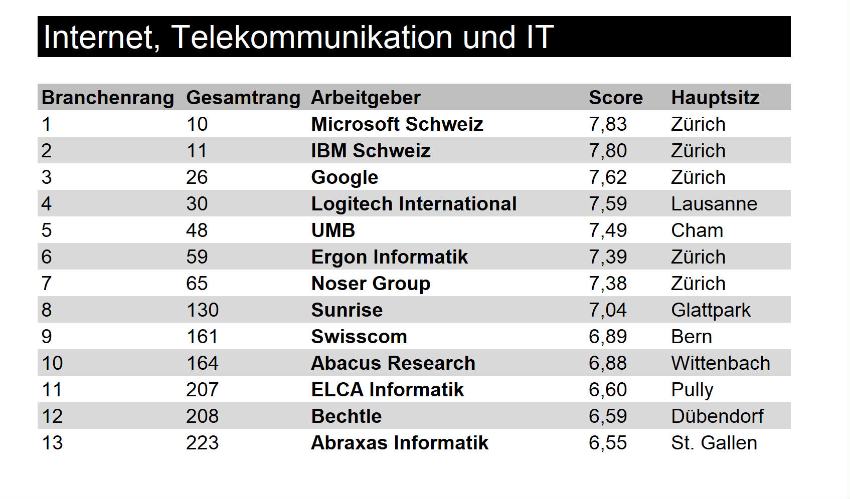 Nebst dem Gesamtranking hat der Aritkel auch Branchenlisten veröffentlicht, darunter die Kategorie Internet, Telekommunikation und IT 2026. Dort führt Microsoft Schweiz mit einem Score von 7,83 und liegt im Gesamtranking auf Platz 10, gefolgt von IBM Schweiz mit 7,80 auf Rang 11. Auf den weiteren Plätzen folgen Google mit 7,62 auf Rang 26 und Logitech International mit 7,59 auf Rang 30, die vollständige Übersicht steht in der Tabelle weiter unten. Der Score ist laut Tabelle der Punktwert aus der Erhebung, die Maximalpunktzahl beträgt 10.