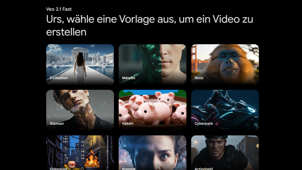 Google jetzt mit einer Neuerung beim Erstellen von Videos mithilfe der KI nach. Weist man Gemini an, ein Video zu generieren, erscheint als Erstes eine Auswahl von Vorlagen in unterschiedlichen Stilvarianten wie beispielsweise metallisch, gehäkelt oder Cyberpunk. Die gewählte Vorlage erscheint danach als erstes Element in der Promptbox und lässt sich durch ein Foto und natürlich einen Textprompt ergänzen. Aus Bild kann man zum Beispiel ein Foto von sich selbst hochladen, um im Video als Hauptdarsteller zu erscheinen.