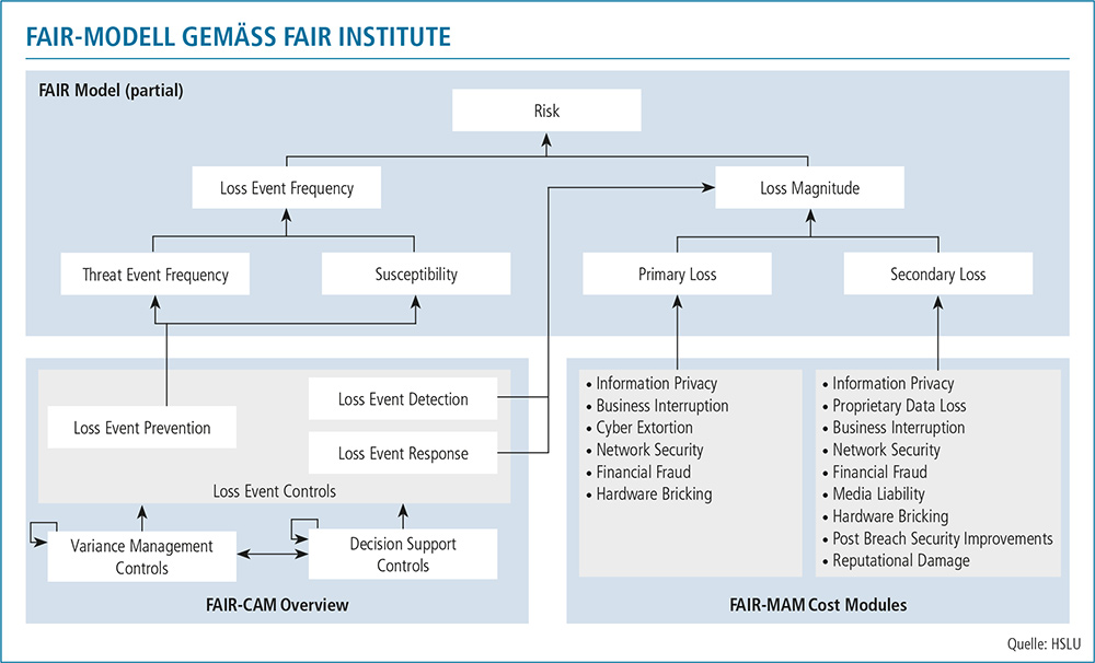 Das FAIR-Modell zeigt, wie sich Cyberrisiken aus der Eintrittswahrscheinlichkeit eines Schadenereignisses und der Schadenshöhe zusammensetzen und in primäre sowie sekundäre Verlustarten unterteilen lassen. (Quelle: Hochschule Luzern HSLU)