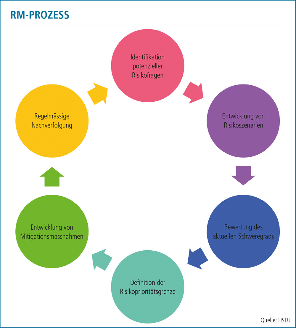 Der Risikomanagementprozess verläuft als Kreislauf, in dem Risiken identifiziert, Szenarien entwickelt, bewertet, priorisiert, Massnahmen abgeleitet und deren Umsetzung regelmässig nachverfolgt wird. (Quelle: Hochschule Luzern HSLU)