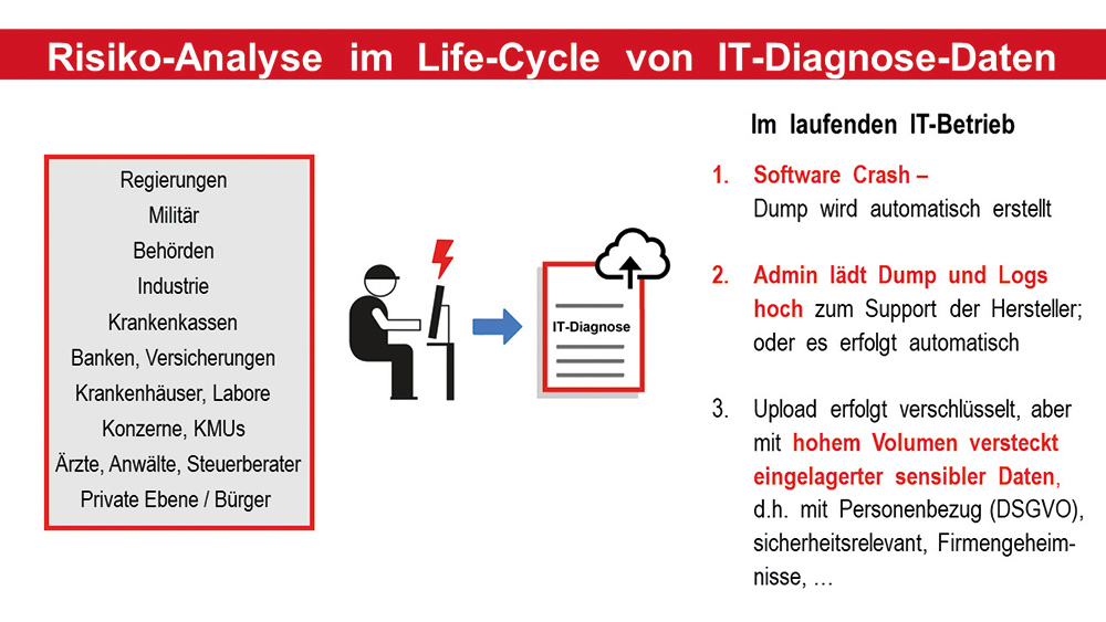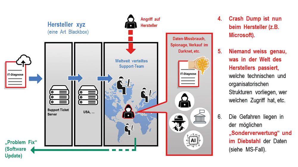 Regelmässigen Zugang zu den «inhaltsreichen» IT-Diagnose-Daten erhalten die weltweiten Software-Anbieter und IT-Dienstleister somit durch den Upload der Dumps und Logs ihrer Support-Kunden. Die Entwicklungs- und Supportzentren der Provider befinden sich meist ausserhalb der Schweiz und Europas, also in USA, Indien, Osteuropa oder China. Im Sinne des Datenschutzes besitzen sie oft kein gleichwertiges Schutzniveau wie die Schweiz. Jedoch auch in Ländern mit gleichwertigem Schutzniveau, wie der EU, bieten die unverhältnismässig umfangreich und zweckfremd in Dumps und Logs versteckt enthaltenen Daten eine grosse Vielfalt datenschutzrechtlicher und sicherheitskritischer Angriffsflächen.
