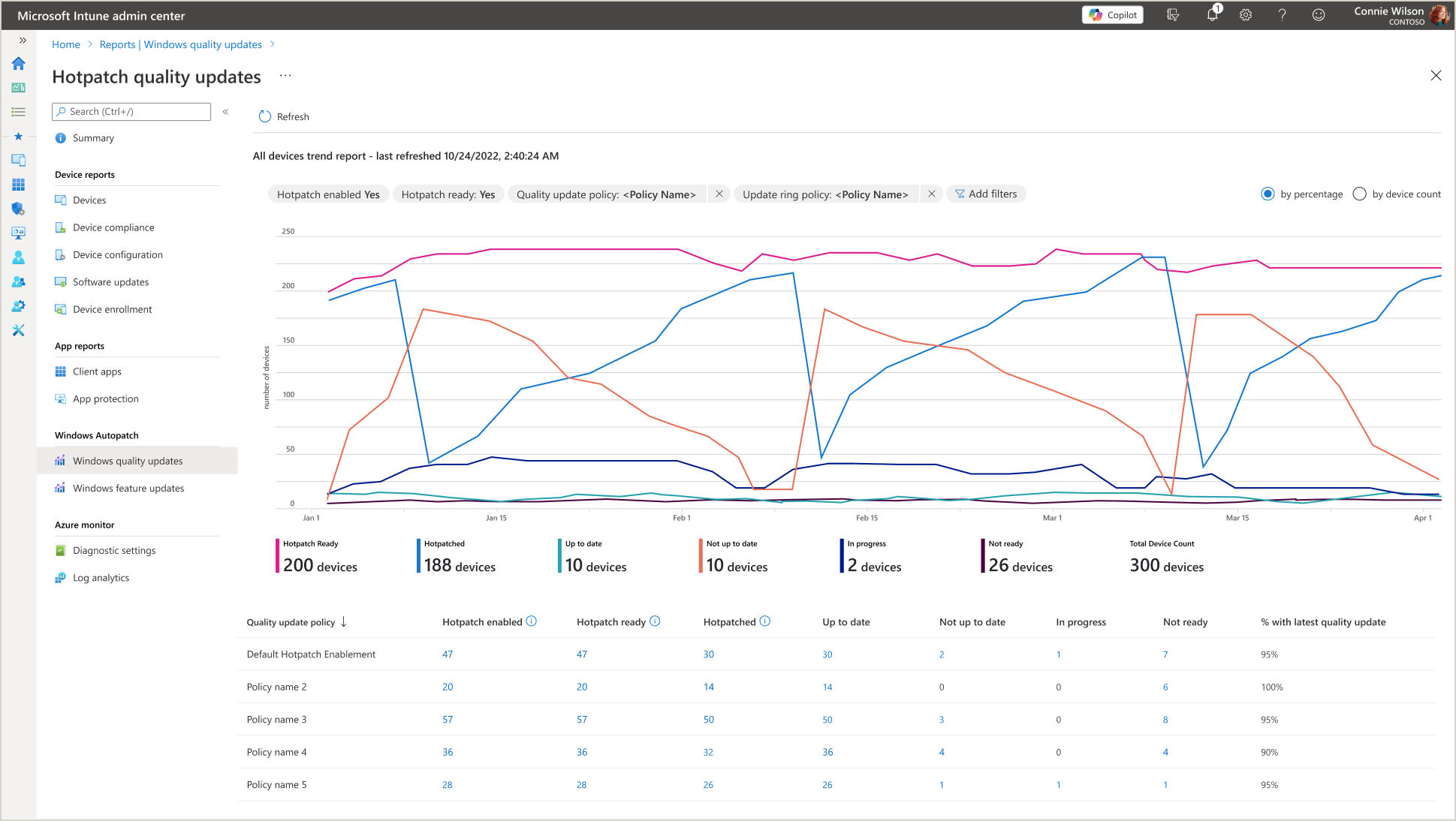 Mit dem Security Update im Mai wird das Einspielen der Updates via Windows Autopatch damit zum Standardverhalten. Ausgeschlossen sind Geräte, auf denen die Quality Update Policy angewendet wird. Weiter lässt sich Autopatch auch ich für einzelne Gerätegruppen oder den ganzen Tenant ausschalten. Rechner, die die oben genannten Voraussetzungen nicht erfüllen, werden weiterhin über den bestehenden Prozess gepatcht. Ob ein Gerät für Autopatch verfügbar ist, kann aus dem Hotpatch Quality Updates Report in Intune ausgelesen werden (siehe Bild unten).
