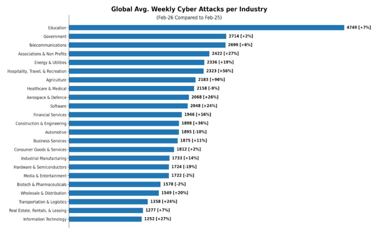 Global gesehen, entfielen die meisten Angriffe auf den Bildungssektor. Hier wurden im Schnitt 4749 Angriffe pro Woche festgestellt. Auf den weiteren Rängen folgen Behörden mit 2714 und Telekommunikationsunternehmen mit 2699 Angriffen.