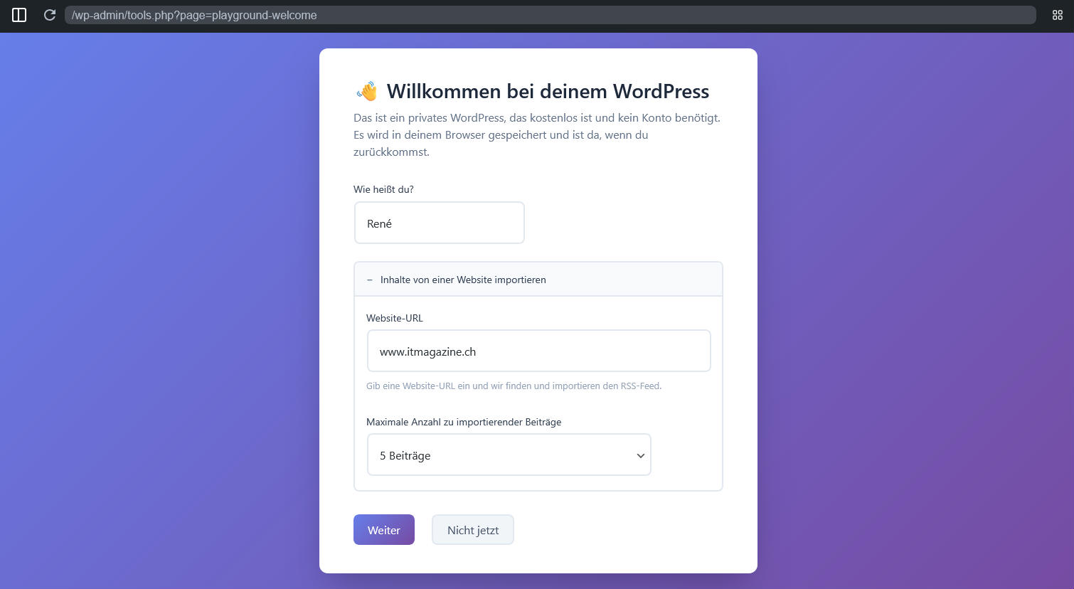 Blog-Beitrag erklären, erfordert die neue Version keine Anmeldung, keinen Hoster und auch keine Domain-Registrierung. Die neue Version arbeitet mit der Technologie von Wordpress Playground und läuft als lokale Instanz beim User.