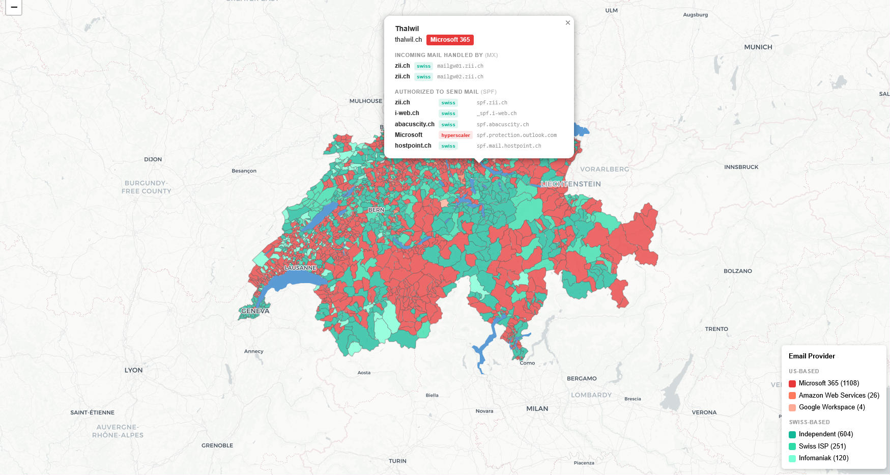 MXmap ein interessantes "kleines Nebenprojekt" vorgestellt. Wie Huser via Linkedin informiert, handelt es sich dabei um eine interaktive Karte, welche über die E-Mail-Provider sämtlicher rund 2100 Schweizer Gemeinden Auskunft gibt. Als Motivation nennt der Entwickler die Neugier auf die digitale Souveränität. US-basierte Anbieter wie Microsoft 365 würden unter den Cloud Act fallen, womit US-Behörden unabhängig vom Standort auf die Daten zugreifen können. Ihn habe interessiert, wie sich die Situation diesbezüglich aktuell gestalte.