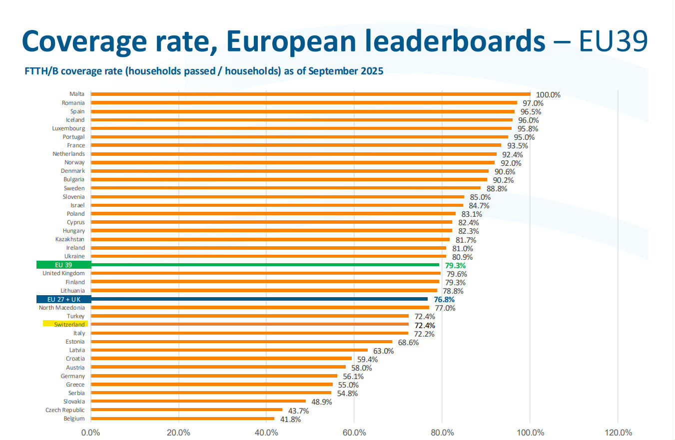 Die Schweiz findet in Sachen Glasfaserausbau langsam den Anschluss. Im Vergleich zum europäischen Durchschnitt hat das Land aber weiterhin noch etwas Aufholbedarf, wie aktuelle Zahlen des FTTH Council Europe zeigen. Die Auswertung mit Stand Mitte 2024 bescheinigte der Schweiz noch einen Glasfaserausbau von gerade einmal 58 Prozent, der Rest Europas lag damals bei 75 Prozent. Rund ein Jahr später, im September 2025, zeigt sich schon eine deutlich bessere Situation: Während man in Europa durchschnittlich bei 79 Prozent FTTH-Abdeckung liegt, hat die Schweiz auf respektable 72 Prozent aufgeholt. Der Wert ergibt sich aus der Abdeckung von 4,1 Millionen Haushalten gemäss BFS. Wenn die Abdeckung anhand der 5,5 Millionen Wohnungen und Geschäfte gemessen wird, kommt die Schweiz auf eine Abdeckung von 54 Prozent.