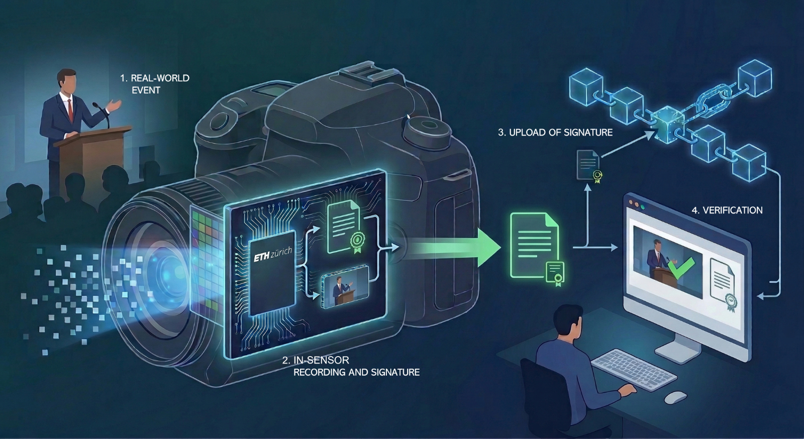 So funktioniert die Technologie: Ein reales Ereignis (1) wird von einer Kamera aufgezeichnet, deren Sensorchip im Moment der Aufnahme sowohl die Bilddaten als auch eine kryptografische Signatur erzeugt (2). Nach der Speicherung in einem öffentlichen Register (3) kann diese Signatur später verwendet werden, um zu überprüfen, dass die Aufnahme authentisch ist und nicht verändert wurde (4). (Quelle: Grafik erstellt mit KI: Felix Franke / ETH Zürich)