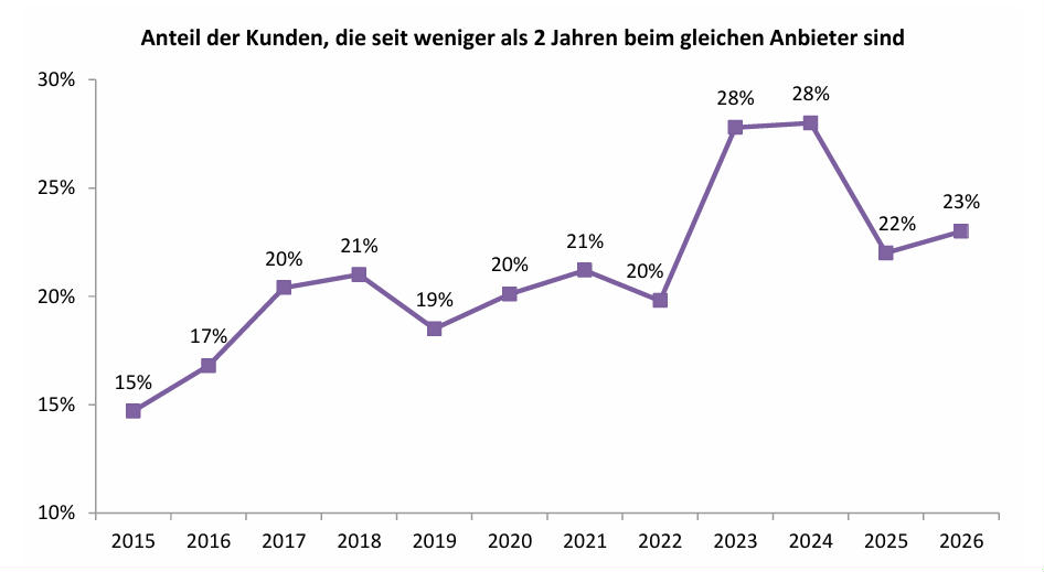 Besonders deutlich ist der Rückgang bei den unter 30-Jährigen. Laut Bonus.ch hatten bei der Umfrage 2024 noch 52 Prozent dieser Altersgruppe ihren Anbieter in den vergangenen zwei Jahren gewechselt. Heuer liegt dieser Anteil noch bei 30 Prozent. Bei den über 60-Jährigen beträgt er 23 Prozent. Grundsätzlich kann man festhalten, dass die Kundentreue mit dem Alter steigt: 55 Prozent der Seniorinnen und Senioren sind seit mindestens fünf Jahren beim gleichen Anbieter, bei den Jüngeren sind es 38 Prozent.