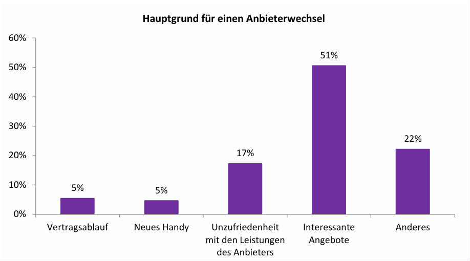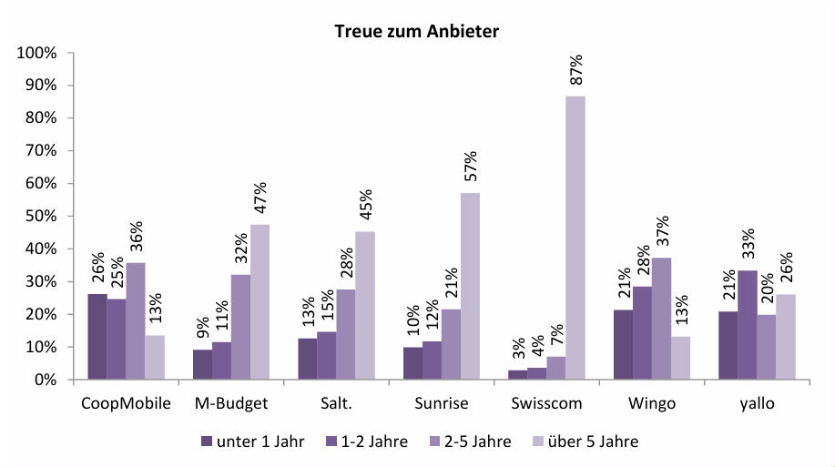 Bei den einzelnen Marken unterscheiden sich die Werte deutlich. Swisscom weist gemäss Bonus.ch die höchste Kundentreue auf: 87 Prozent der Kundschaft sind seit mehr als fünf Jahren dort. Bei Sunrise sind es 57 Prozent, bei M-Budget 47 Prozent und bei Salt 45 Prozent. Gleichzeitig fällt der Anteil der innerhalb der letzten zwei Jahre gewonnenen Neukunden bei Swisscom mit 7 Prozent recht tief aus. Bei Yallo liegt dieser Wert bei 54 Prozent, bei Coop Mobile bei 51 Prozent und bei Wingo bei 49 Prozent. Als wichtigsten Grund für einen Anbieterwechsel nennen 51 Prozent der Befragten ein attraktiveres Angebot bei der Konkurrenz. An zweiter Stelle folgt die Unzufriedenheit mit den Leistungen des bisherigen Anbieters mit 17 Prozent.