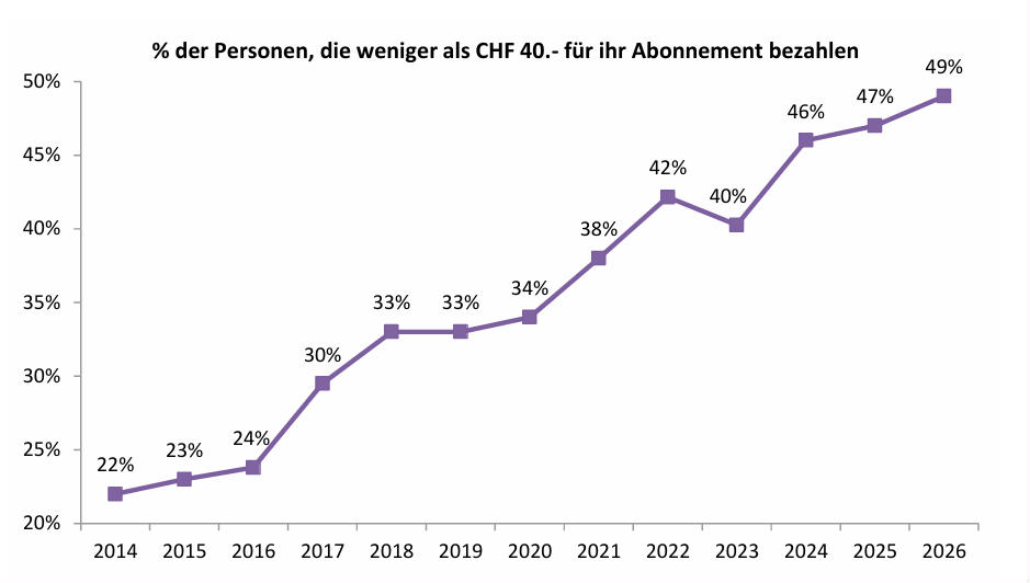 Die Umfrage zeigt auch, dass Mobilfunkabos in den vergangenen Jahren günstiger geworden sind. 49 Prozent der Befragten zahlen gemäss neuer Umfrage weniger als 40 Franken pro Monat für ihr Abonnement. 2015 lag dieser Anteil noch bei 23 Prozent. Gleichzeitig ist die Unzufriedenheit mit dem Preis-Leistungs-Verhältnis deutlich zurückgegangen: Während 2015 noch 71 Prozent die Tarife als unbefriedigend bewerteten, sind es 2026 noch 11 Prozent.