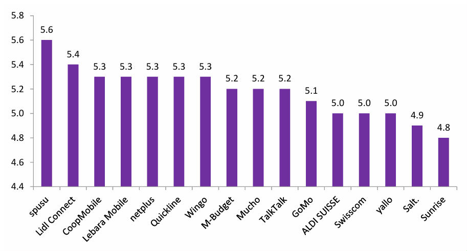 Bei der Gesamtzufriedenheit erreichen die Mobilfunkanbieter laut Bonus.ch 2026 erneut eine Durchschnittsnote von 5,2 von 6 Punkten. Damit bleibt das Niveau im Vergleich zum Vorjahr stabil. An der Spitze der Rangliste steht neu Spusu mit einer Note von 5,6. Auf Platz zwei folgt Lidl Connect mit 5,4. Dahinter liegen Coop Mobile, Lebara Mobile, Netplus, Quickline und Wingo mit jeweils 5,3 Punkten. Die drei Netzbetreiber Swisscom, Salt und Sunrise kommen auf die Noten 5,0, 4,9 sowie 4,8. Die detaillierten Noten zu jedem Carrier kann man auf dieser Seite abrufen. (mw)