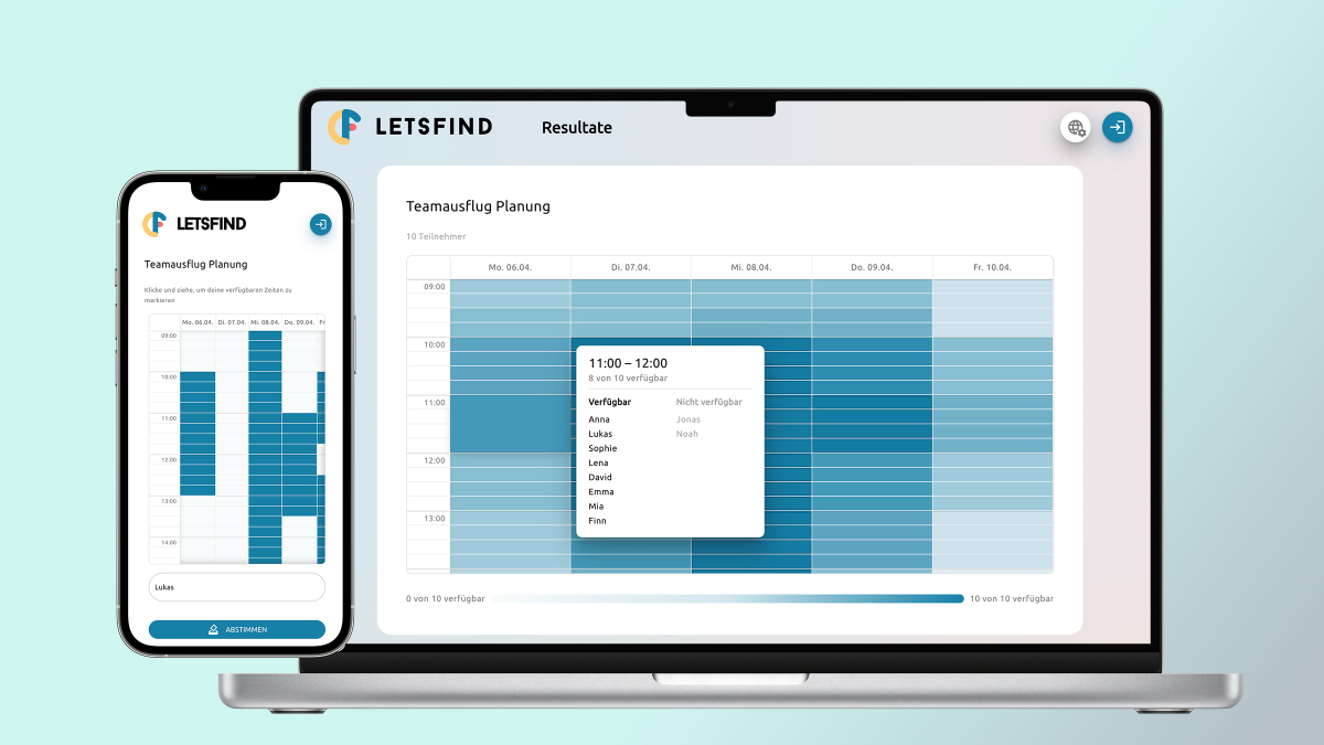 Letsfind, das 2020 lanciert wurde, will der Schweizer Entwickler Samuel Schaffranek unter dem stolzen Motto "When2meet, But Make It 2026" jetzt eine andere Lösung bieten: Neu bietet die Umfrageplattform sogenannte Verfügbarkeitsumfragen, die mit einer visuellen Gruppenterminplanung mit interaktiven Zeitraster sowie einer Heatmap-Auswertung aufwarten, die auch bei vielen Teilnehmenden die beste Option sichtbar macht.