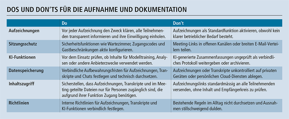 Unternehmen müssen festlegen, welche Personendaten in Meetings zu welchem Zweck bearbeitet werden und welche Funktionen dafür erforderlich sind. Ob ein Meeting nur live stattfindet oder zusätzlich aufgezeichnet, transkribiert oder archiviert wird, ist dabei wesentlich. Daraus folgen insbesondere Anforderungen an Transparenz, Aufbewahrung und Schutzmassnahmen: