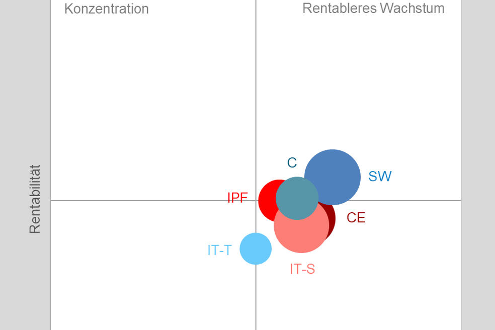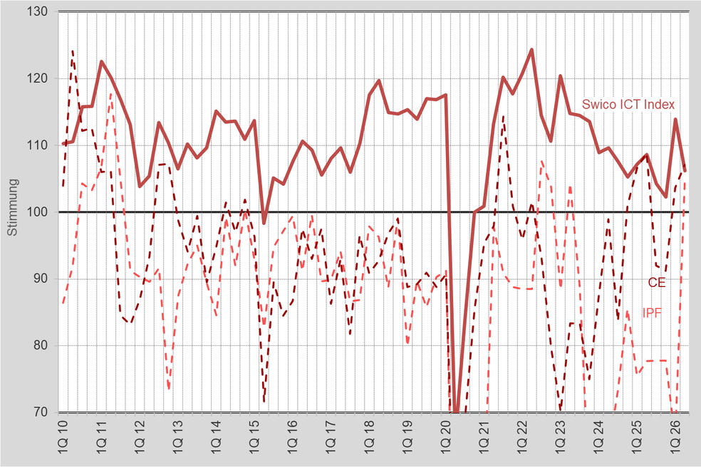 Auch die einzelnen Segmente entwickeln sich unterschiedlich. Software übernimmt mit 110,4 Punkten neu die Spitzenposition innerhalb der ICT-Branche, verliert gegenüber dem Vorquartal aber 3,5 Punkte. Consulting sinkt um 5,7 Punkte auf 106,9 Punkte, IT-Services um 7,8 Punkte auf 105,7 Punkte. Beide Bereiche bleiben damit über der Wachstumsgrenze. IT-Technology verzeichnet mit minus 18,7 Punkten auf 97,7 Punkte den deutlichsten Rückgang und fällt unter die Marke von 100 Punkten. Positiv entwickelt sich dagegen Consumer Electronics, das um 3,4 Punkte auf 107,1 Punkte zulegt. Noch deutlicher fällt die Erholung im Bereich Imaging, Printing, Finishing aus, der nach dem starken Einbruch im Vorquartal um 38,4 Punkte auf 104,4 Punkte steigt und damit erstmals seit 2023 wieder die Wachstumsgrenze überschreitet.