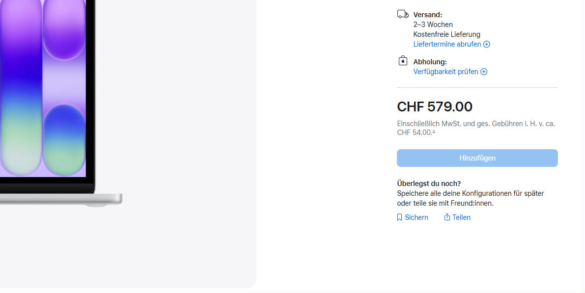 Ebenfalls zwei bis drei Wochen warten muss man auf das brandneue Macbook Neo, während das Macbook Air, das Macbook Pro und der iMac offenbar ab Lager zu haben sind.