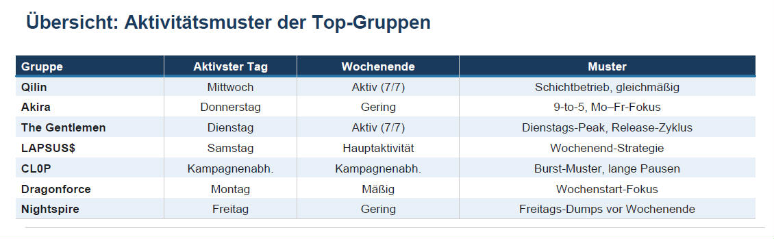 Weiter kategorisiert die Studie eine Handvoll der bekanntesten Hacker-Gruppen nach ihren Arbeitsmustern. Qilin etwa "kenne kein Wochenende", so die Autoren – die Gruppe ackert im Schichtbetrieb mit mehreren Teams. The Gentlemen hingegen hat einen recht festen Release-Zyklus: Am Wochenende werden die Hacks durchgeführt und überwiegend am Dienstag veröffentlicht. Lapsus$ veröffentlicht derweil fast nur an Wochenenden. Die Hacker von Akira scheinen derweil eine recht normale Arbeitswoche zu haben und arbeiten vor allem zwischen Montag und Freitag mit einem deutlichen Rückgang am Wochenende. Die Gruppe CL0P kennt keine fixen Arbeitszeiten, dafür projektartige Muster: Mit einer neuen Schwachstelle werden in wenigen Tagen hunderte Opfer angegriffen, danach herrscht manchmal über Wochen hinweg völlige Stille.