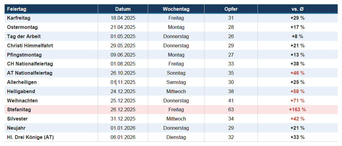 Die Angriffe selbst finden demnach überdurchschnittlich oft an Wochenenden statt. Hintergrund dafür ist wohl, dass die Reaktionszeiten an Samstagen und Sonntagen eher schlechter sind und die Angreifer länger Zeit haben, in IT-Umgebungen einzudringen. 53 Prozent aller Angriffe entfallen auf Wochenenden, Feiertage oder auf Tage mit relevanten Unternehmensumstrukturierungen. Bezeichnend ist hierfür etwa die beobachtete Aktivität um die Weihnachtszeit 2025: Am 24., 25. und 26. Dezember war die Zahl der Opfer laut Studie erheblich grösser als im Durchschnitt – um beachtliche 58, 71 und 163 Prozent. Und am 1. August 2025 wurden 38 Prozent mehr Opfer registriert als im Durchschnitt.
