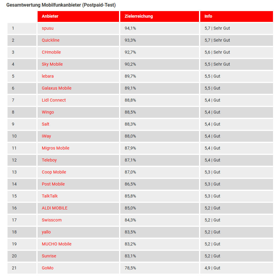 Spusu, auf den Plätzen 2 bis 5 sind Quickline, CHmobile, Sky Mobile und Lebara.
