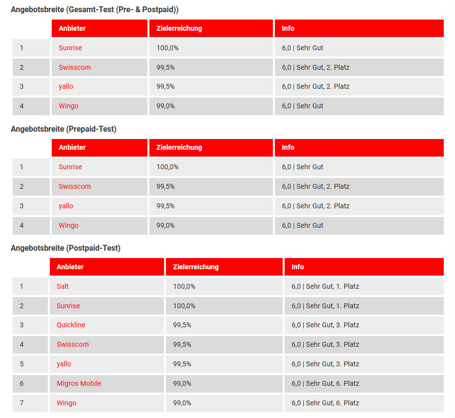 Sunrise: Sowohl im Prepaid-Bereich als auch in der Gesamtwertung ist hier die Angebotsbreite am grössten. Nur bei den Postpaid-Abos muss Sunrise sich den ersten Platz mit