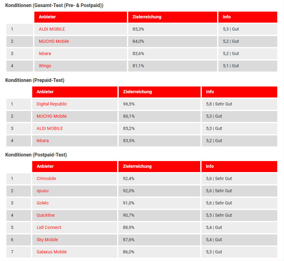 Aldi Mobile und Mucho Mobile. Die Gesamtwertung der Postpaid-Anbieter gewinnt derweil