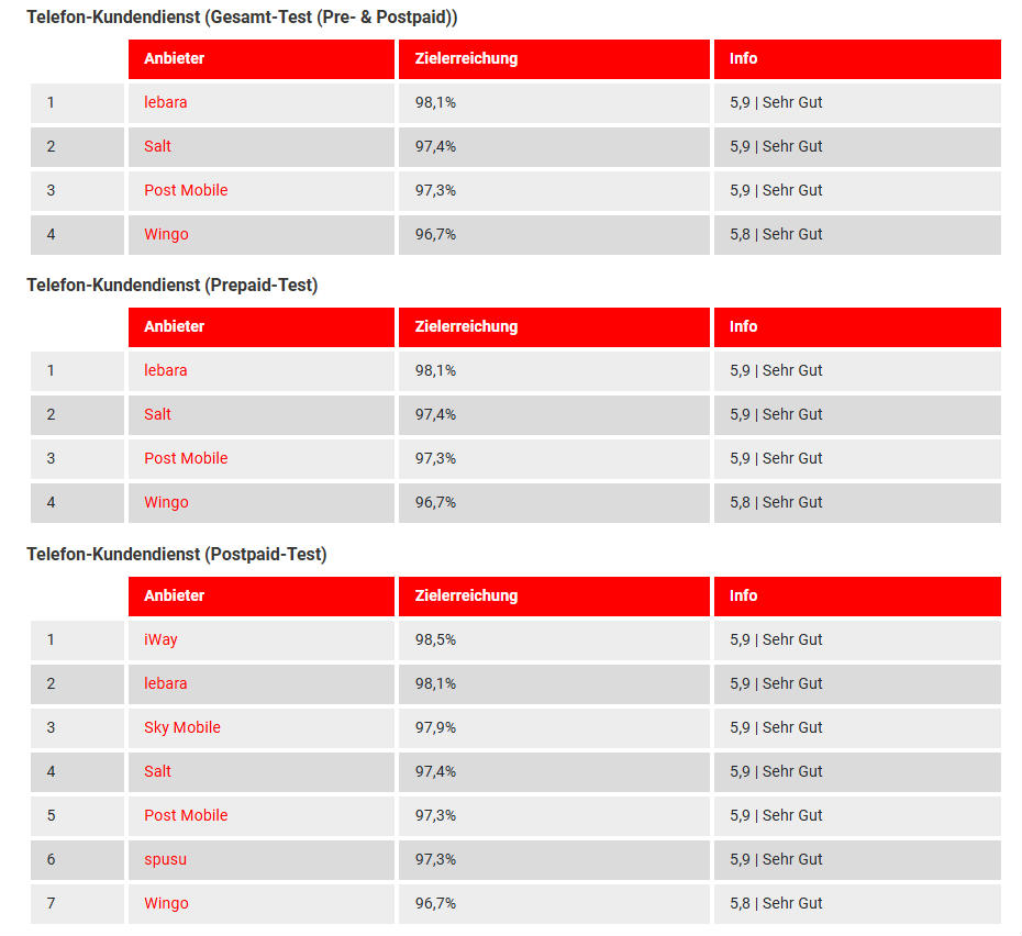 Rund um den telefonischen Kundendienst zeigen sich die Tester recht kritisch: Die Erreichbarkeit ist teils schlecht, auch nach mehreren Versuchen und Minuten Wartezeit konnte teilweise kein Kundendienstmitarbeiter erreicht werden. Wenn man aber jemanden am Apparat hatte, waren die Antworten meist gut, wenn auch kurz. Sowohl bei Prepaid-Bereich als auch in der Gesamtwertung machte Lebara das Rennen,