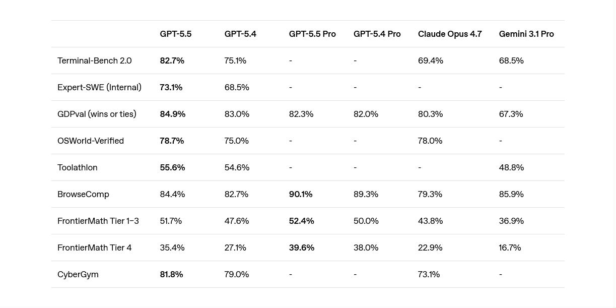 Blog-Beitrag erklärt, handelt es sich bei GPT-5.5 um das bis anhin intelligenteste und intuitivste Modell, das den nächsten Schritt in Richtung einer neuen Art, Arbeiten am PC zu erledigen, ermöglicht. Wie OpenAI verspricht, versteht GPT-5.5 schneller, was der User beabsichtigt und vermag einen grösseren Teil der Arbeit selber zu übernehmen. Das neue Modell soll sich besonders beim Schreiben und Debuggen von Code, bei Recherchen, der Datenanalyse, bei der Dokumenterstellung oder bei der Bedienung von Software auszeichnen. Statt Schritt für Schritt abzuarbeiten ist das Modell in der Lage, auch unübersichtliche, mehrteilige Aufgaben auszuführen. Trotz der gesteigerten Leistungsfähigkeit soll bei der Antwortgeschwindigkeit kein Nachteil resultieren und die Geschwindigkeit pro Token soll jener des Vorgängermodells GPT-5.4 entsprechen. Wie diverse Benchmarks zeigen, liefert das jüngste Modell auch über alle Disziplinen die besseren Ergebnisse als das Vorgängermodell.