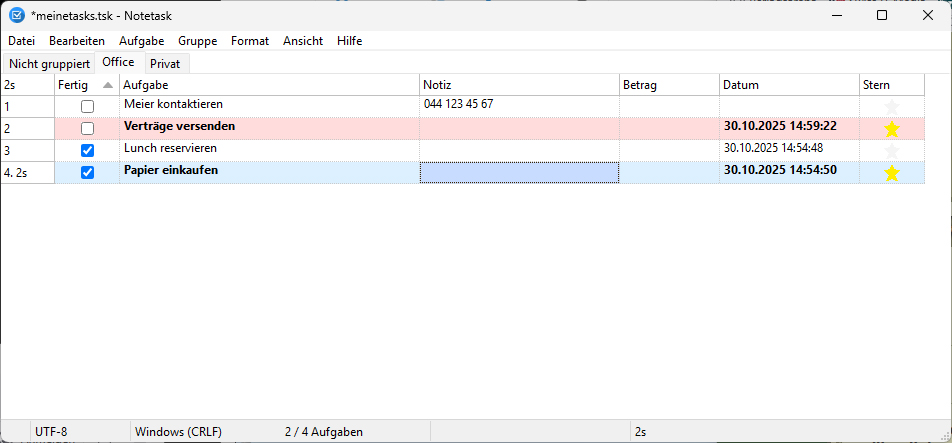Notetask ist eine einfach gehaltene Aufgabenverwaltung, die viel Flexibilität bietet. So können Aufgaben in Gruppen organisiert werden, die als Register anzeigt werden. Aufgaben lassen sich mit einem Datum, Notizen oder einem Betrag erfassen und können per Checkbox als Fertig markiert werden. Weiter lassen sich beliebig viele Aufgabensammlungen anlegen und abspeichern. Ebenfalls vorhanden ist eine Suche, eine Druckfunktion wie auch die Möglichkeit, das Tool optisch anzupassen.