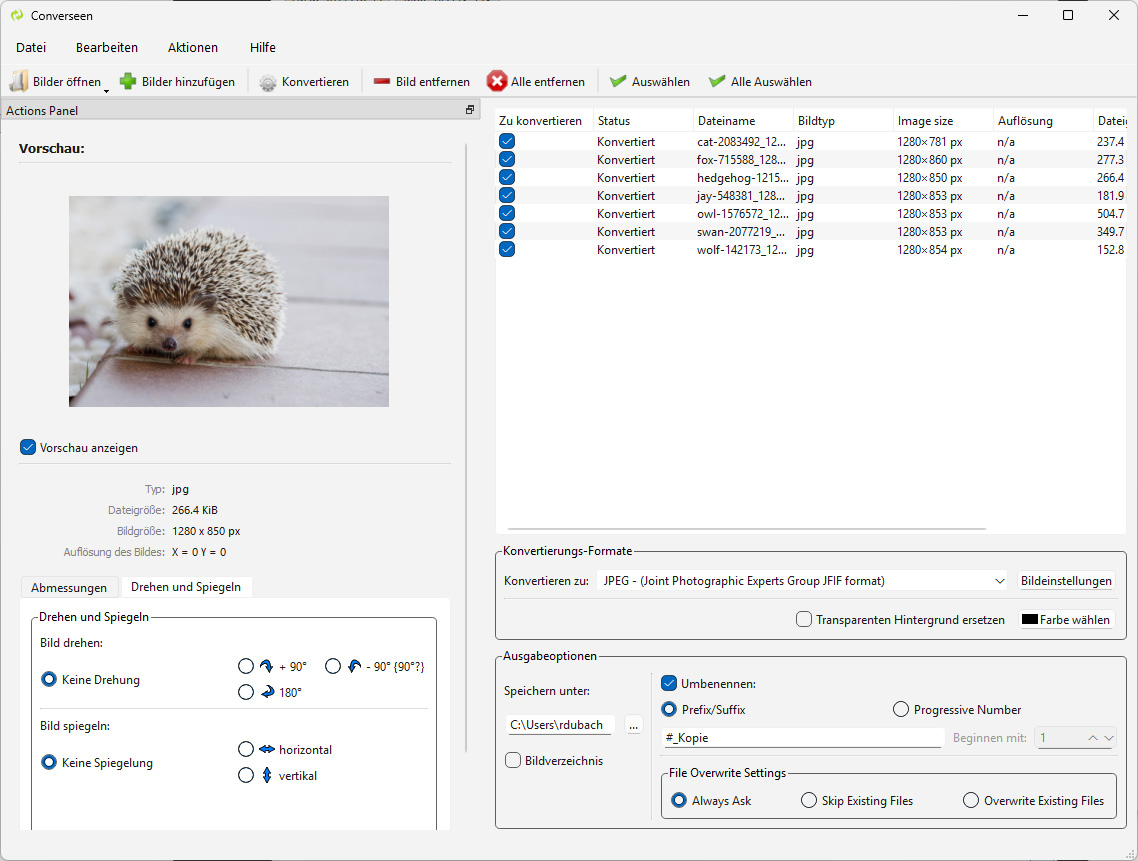 Mit Converseen lassen sich zahlreiche Grafikdateien mit einem Schlag in eine anderes Format konvertieren, wobei insgesamt über 100 Formate unterstützt werden. Dazu ist es möglich, die Bilder in der Grösse zu ändern oder sie zu drehen respektive zu spiegeln. Schliesslich vermag das Tool auch PDF-Dokumente in Einzelbilder umzuwandeln.